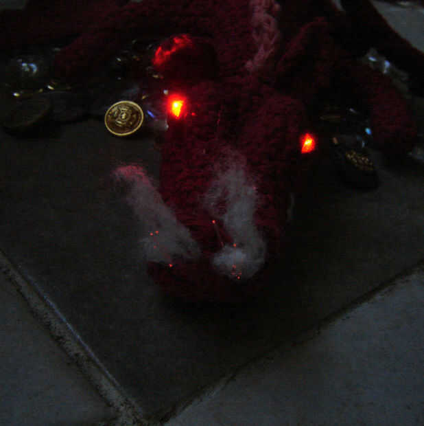 Mientras yo estaba ganchillo mi dragón, me di cuenta de que empezó a ver muy lindo, y Smaug el principal y más grande de calamidades no es lindo. Para hacer le mirada más temible he añadido algunos elementos extremos (bien extremas cuanto ganchillo). Usé LEDs rojos para los ojos y humo y chispas de su nariz.