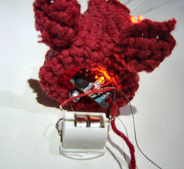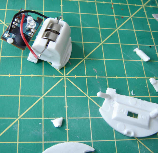 Utilicé el LED parpadeo naranja de la candelita para las chispas y transmitido por fibra óptica a las fosas nasales.  Para simplificar cosas, conectado los LEDs para los ojos en paralelo a la placa de circuito de la candelita ya que cuenta con su propia batería y encendido/apagado.  Para hacer esto: primero retire la cubierta de la luz del té.  Rompa el plástico sobrante (de modo que pueden caber en el cabeza y el cuello del dragón).  Conecte el hilo de dos de los LEDs a la placa de circuito, ten cuidado de donde se coloque, en algunos puntos que los ojos oscilará así...