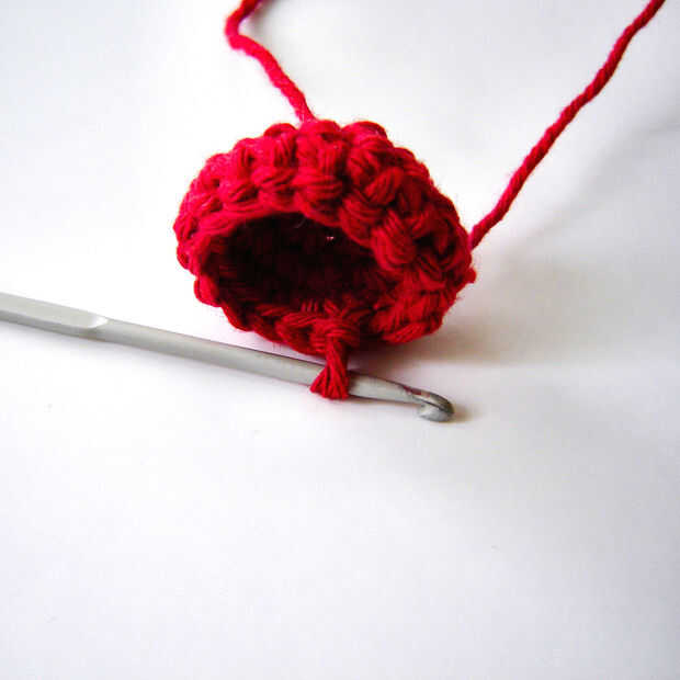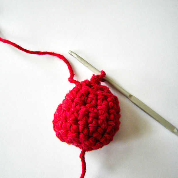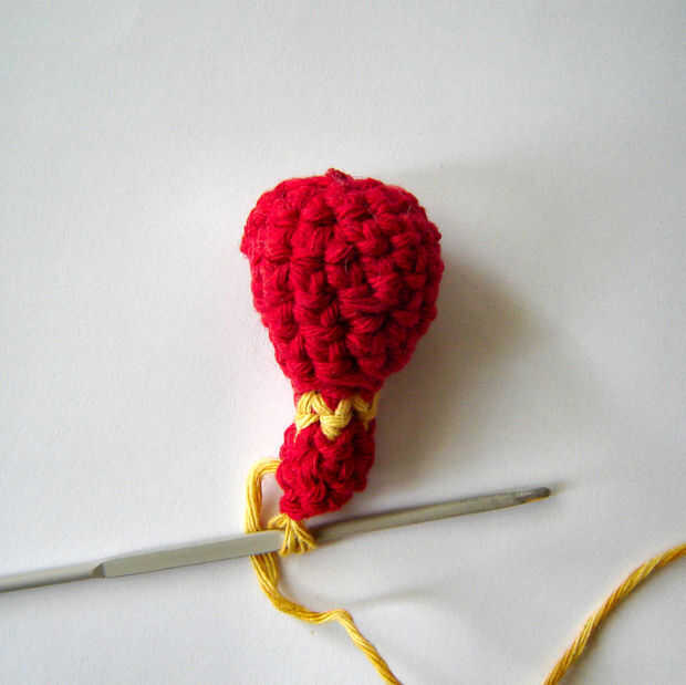 Rnd 10: En rojo; SC, SC, sl st en primero (6sts)