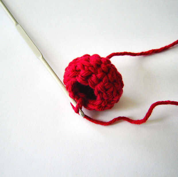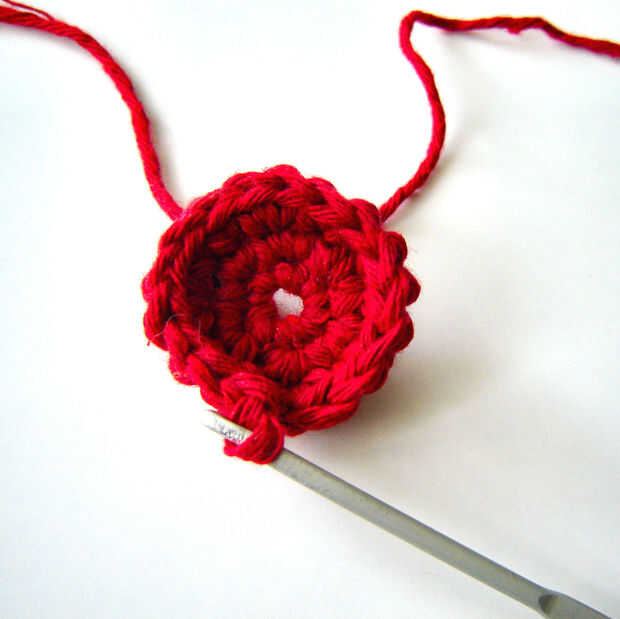 9 RND: en rojo; SC, SC, sl st en primero (6sts)