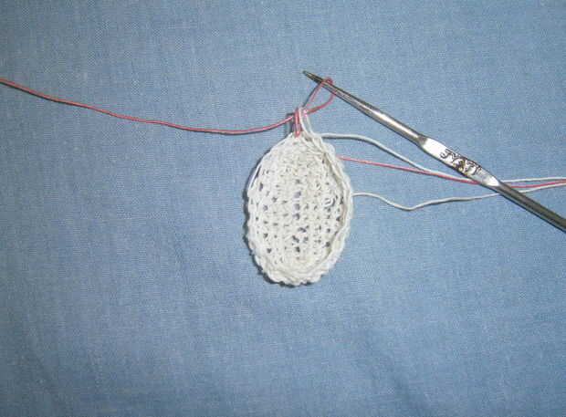 Ahora coge el hilo rosa y páselo a través de los lazos.
