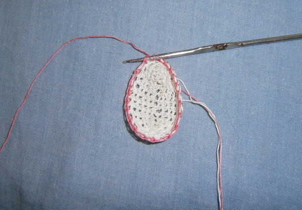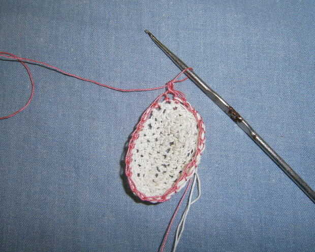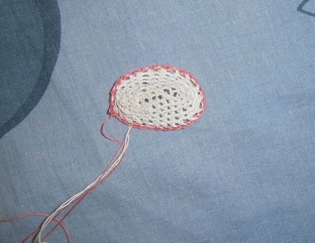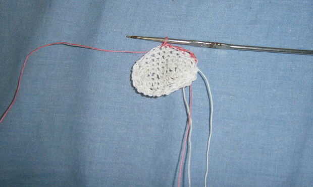 Hacer la puntada de ganchillo solo con el hilo rosa para toda la circunferencia del círculo.