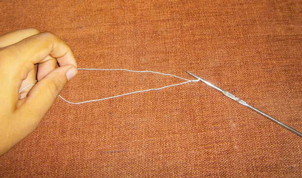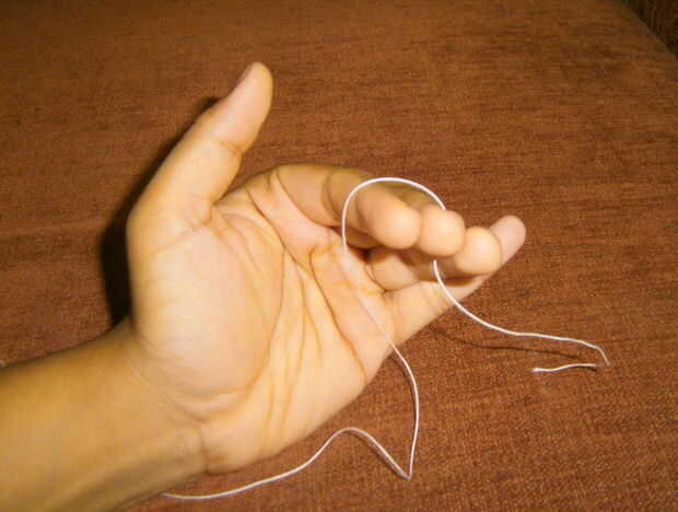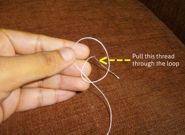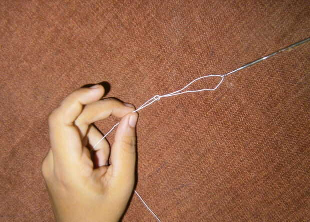 Tirar de los hilos para que el nudo se tira para arriba en el gancho.