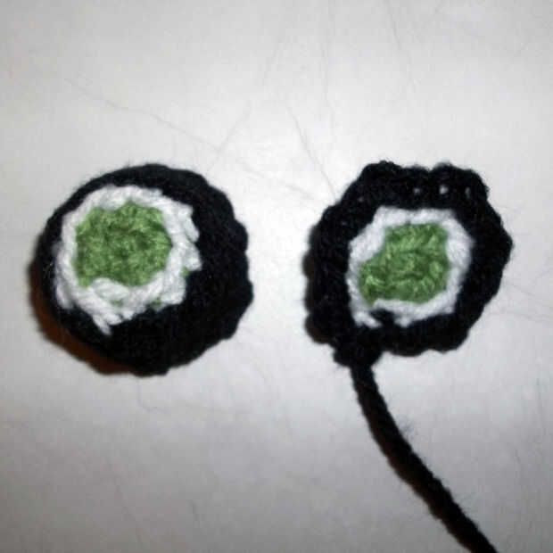 Fije apagado. Cosas con relleno de poliéster. Ponga a un lado. Repita los pasos de R1 a R3. Fije apagado. Deja una cola larga para atar. Coser las 2 piezas juntas añadiendo relleno. Fije apagado. Ponga a un lado.