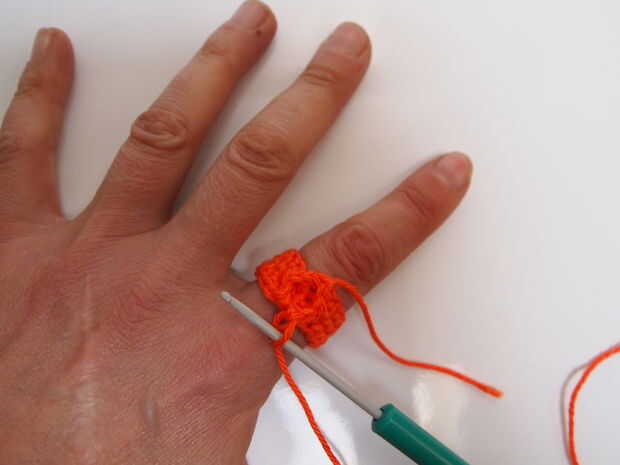 cadena 1, ahora sc1 en una protuberancia en el centro del anillo, se trata de la extremidad izquierda de la base del círculo imaginario de la corona, chn 1. Usted ha ahora "cruzado" la anchura del anillo. SC2 en las cadenas que forman el borde exterior del anillo. CHN 1, sc 1 en una protuberancia en el centro del anillo, chn 1, sc 2 en las cadenas que forman el borde exterior opuesto. Esto debe formar un círculo limpio de 10 lazos.