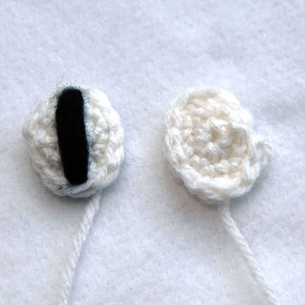 Hice mis ojos como óvalos para darles un poco más de altura y había cosido a una pupila larga con hilo negro (véase abajo).