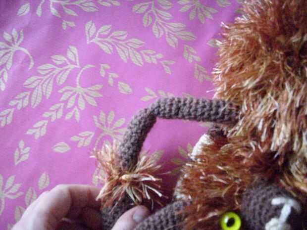 Con hilado simple, hacer una costura en el centro de los brazos y las piernas, rodillas y codos (ver imagen). Por lo tanto más fácilmente se doblan, y habilidades de sentarse el mono-oso-gato son mejores. Especialmente cuando quieres que se sientan en un borde, con las piernas balanceándose.