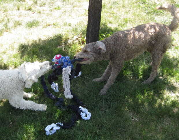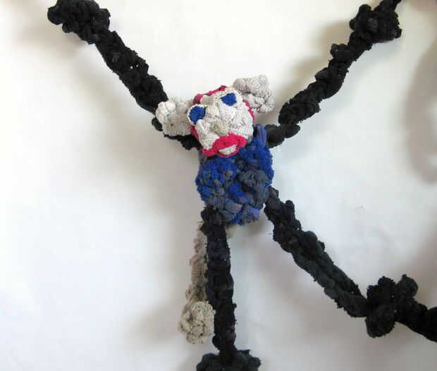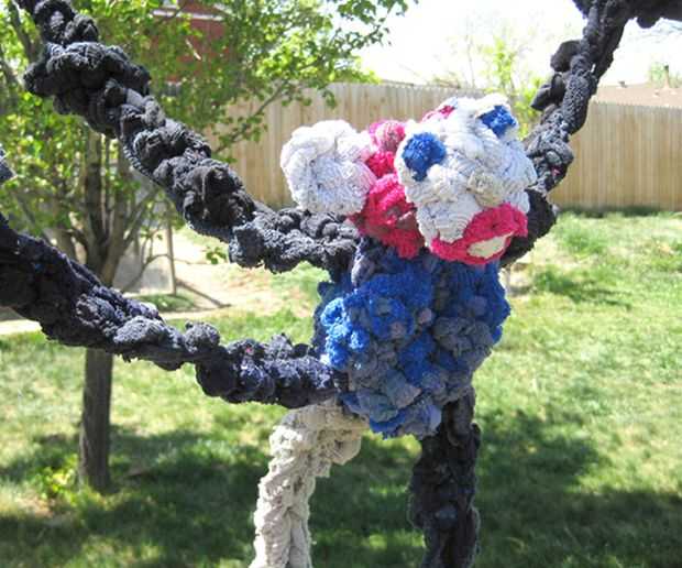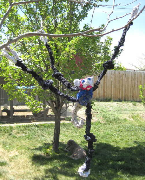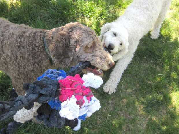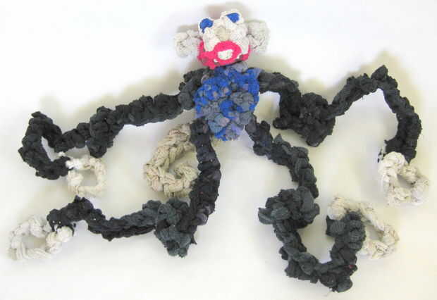 Decidí hacer algunos sarn en un mono de juguete de remolcador para mis perros porque encantan jugar remolcador pero destruyen fácilmente la mayoría de los juguetes que les damos. (Y qué perro no quiere golpear a un mono mudo mirando?) La longitud de los brazos y las piernas del diseño de mono son como nuestro remolcador más larga de la cuerda (cerca de 1,5 metros o 5 pies, cuando se estira), así que da los perros (y humanos) un montón de sitio para estar en cualquiera de los extremos o. Hasta ahora se sostiene bastante bien contra nuestros perros y es fácil de reparar.