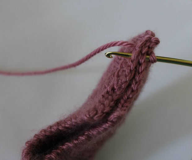 Una vez que haya completado todas sus filas, poner la primera fila y la última traseros fila juntos y sl st en el lado. Me volví a la falda de adentro hacia afuera por lo que se podía ver la costura. Entonces, sc uniformemente alrededor de la parte superior de la falda, hasta que sobre sts de 30-35. Ahora vas a estar trabajando en rondas, así que no sl st al principio, pero colocar un marcador de punto en la última puntada y moverlo hacia arriba de cada ronda.
