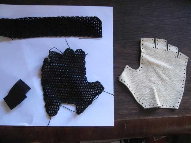 Estos guantes tienen lados de Palma de cuero y ganchillo lados traseros y pulsera que se cierra con velchro. El método consiste en una parte posterior de la pieza de mano de ganchillo y fije el lado de la palma de cuero con algunos zig-zag cadena ganchillo. La pulsera es de ganchillo por separado.