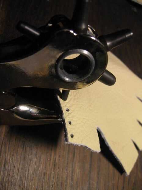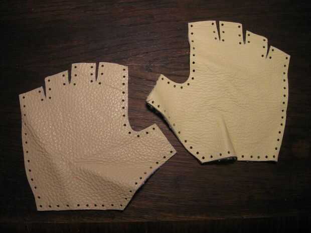 Perforadora de tamaño adecuado y los agujeros alrededor de los pedazos de cuero dejando solo los extremos de los dedos intactos. Tenga cuidado de no dejar material demasiado estrecha entre el agujero y el borde. A partir de cada esquina y haciendo centros de última cara pueden ayudar a mejor posicionamiento de los agujeros.