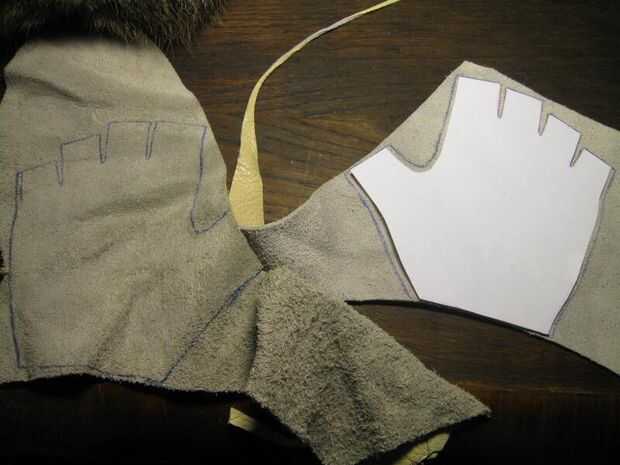 Colocar un recorte de la parte de cuero en tu palm y doblar los dedos como le agarras una barra. Las partes del dedo no deben alcanzar segunda articulación de los dedos en esta posición. Si llegan allí ajuste apagado y también hacer cambios en su patrón de papel.