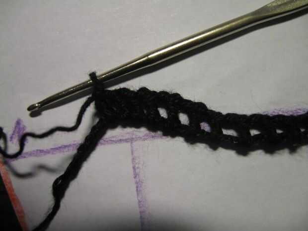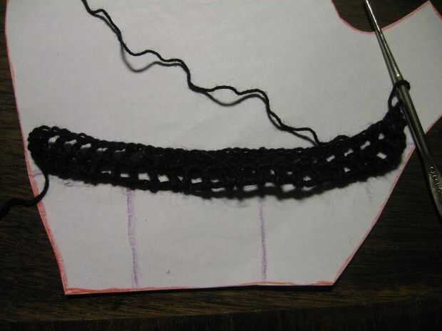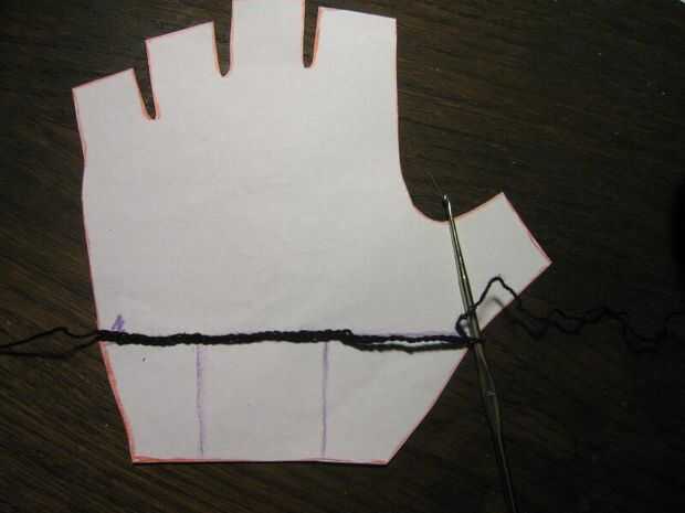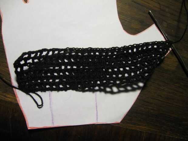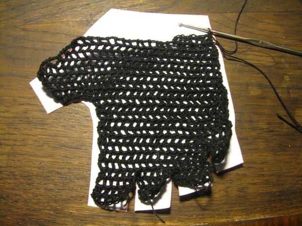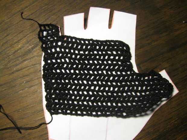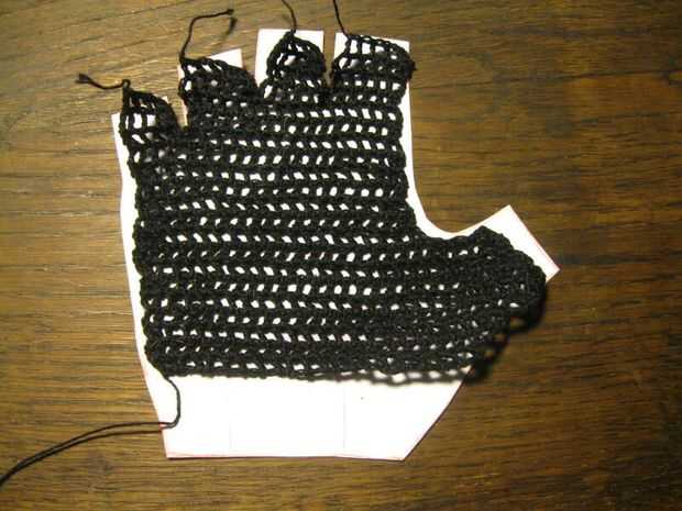 Crochet puntadas de cadena que van horizontalmente sobre el patrón donde el agujero termina además algunas puntadas para la siguiente altura de filas (ver imágenes). Proceder con las filas que se alternan una puntada doble (como en este tutorial http://www.crochetspot.com/how-to-crochet-double-crochet-stitches-dc/) a stich una cadena. Poner el ganchillo en el patrón al final y principio de cada fila y crecer o se encogen una fila según el patrón. Puede que necesite "más arriba" doble de la puntada para hacer eso. Eso es más o menos "estilo libre" ganchillo como ningún patrón exacto del ganchillo puede ser dado, basta con comparar el patrón de la mano. Los bordes no pueden ser perfectos pero no muestra mucho en los guantes terminados. Si llega a los dedos entonces usted probablemente tiene que terminar y empezar un hilo algunas veces para hacer los dedos separados. Sólo ser creativos con su freestyling y si va muy mal entonces rasgar algunos y rehacer.