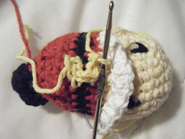 INSTRUCCIONES especiales para la SANTA: 9 Rnd es de color rojo, Rnd 10 es negro, las hileras restantes son de color rojas. Luego coser una hebilla pequeña con hilo amarillo en la parte central en la parte negra para hacer la parte negra se vea como un cinturón. Esta parte es difícil de explicar. Sc 3 en el centro frontal del cuerpo a lo largo de la parte inferior de la parte negra, luego salta hasta la fila por encima de él y sc 3 a través de. Luego unir los extremos con un sl St revisa las fotos para ver lo que me refiero.