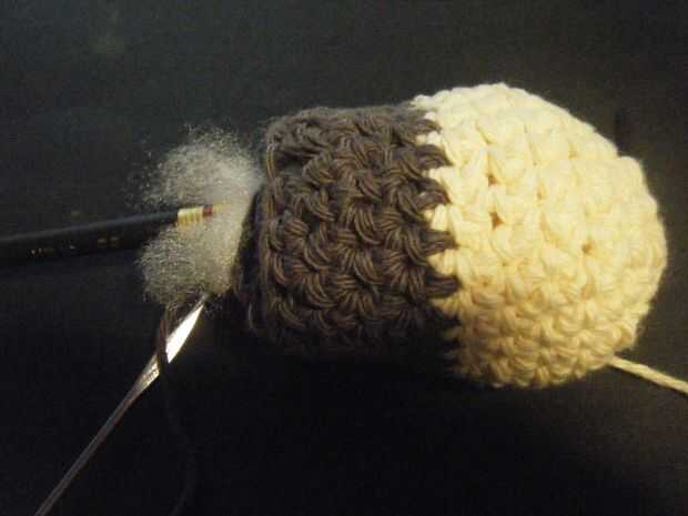 RND 15: [1 sc a st siguiente, sc2tog] 5 veces (10 CTS). Se llenan la cabeza/cuerpo relleno hasta que quede.