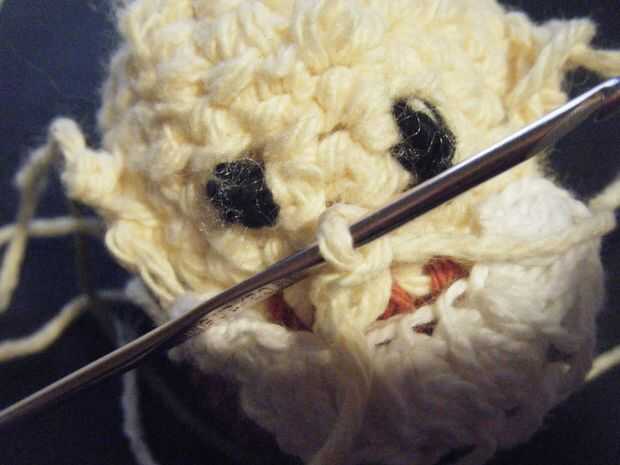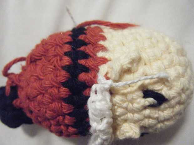 Para los ojos (con negro), sc en fila de st aproximadamente 1 arriba y 2 st al lado de la nariz. Tejer en los extremos.
