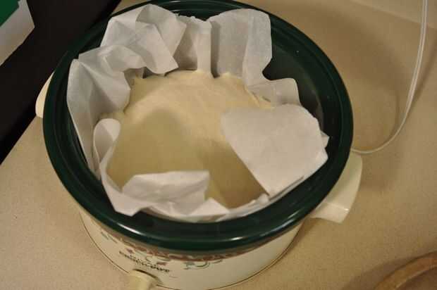 Una vez que se ha precalentado, levantar la masa por el papel de pergamino y transferir la masa y el papel en la Crock-Pot.