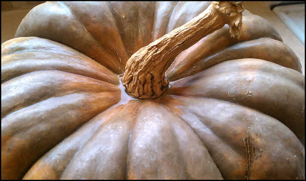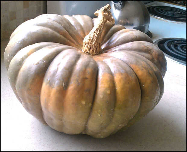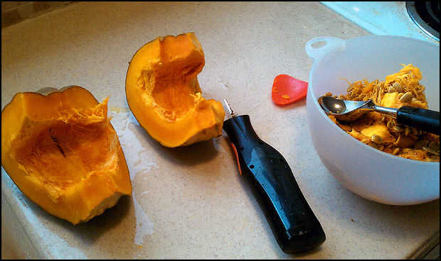 Si tienes una calabaza redonda bastante clásica, puede cortar la parte superior y empezar a sacar con pala hacia fuera la carne primero. Pero algunas calabazas, como mi azul de Queensland, están mejores corte abierto primero llegar a la pulpa y las semillas!