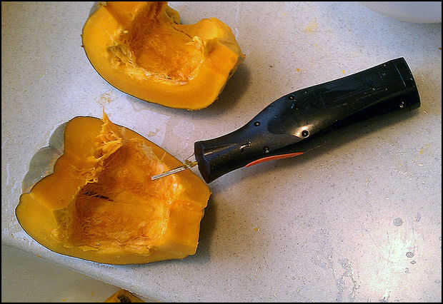 Después del lavado, intenté cortar a través de la calabaza. Dependiendo de la variedad de la calabaza, esta podría ser una tarea difícil. He utilizado un azul de Queensland; ellos tienen la piel gruesa y muy "curvas", usé un cuchillo calabaza que tengo durante Halloween para cortar a través de la piel gruesa. (Imagen 3)