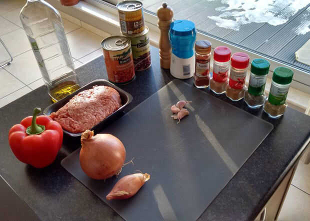 Mi Chile es abundante y delicioso y está hecho con una mezcla de carne molida, cebolla, ajo, pimiento, Chile en polvo, comino, orégano, albahaca, productos de tomate, frijoles y hojas de laurel.No hay nada como un plato caliente de Chile en una noche