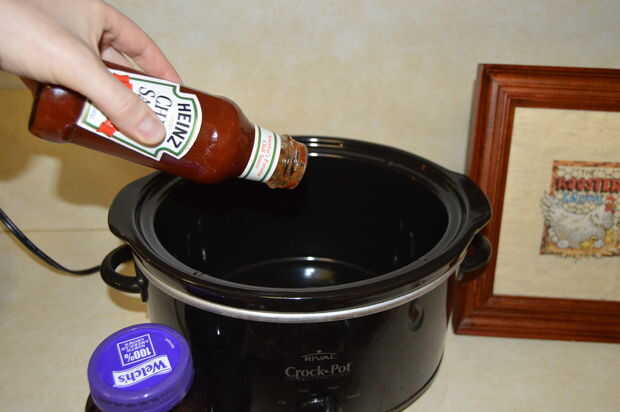 Enchufe su gloriosa creación, llamado un Crock-Pot. Luego añadir alguna salsa de Chile; una botella para cada bolsa de Smokies Lit'l que usted planea hacer. Usé 3 botellas.