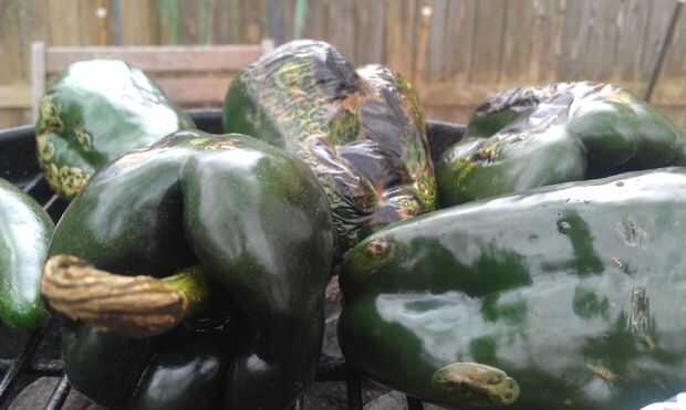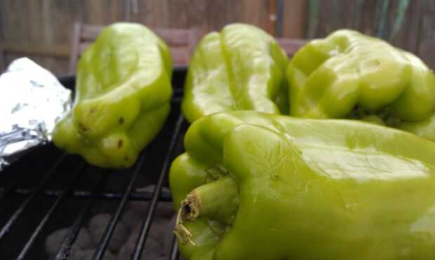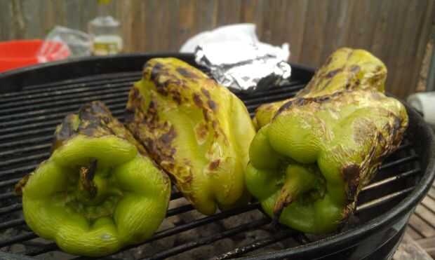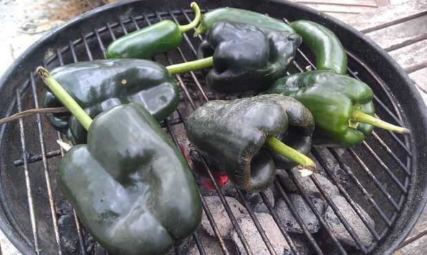 • Trabajar en lotes con el char Cubanelles, Poblanosy jalapeños, los pimientos directamente sobre los carbones. Continúe hasta que la piel está ennegrecida.