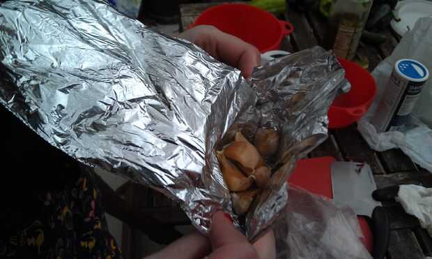 • Envuelva los 6 dientes de ajo en papel de aluminio y colocar en la parte indirecta de la parrilla.