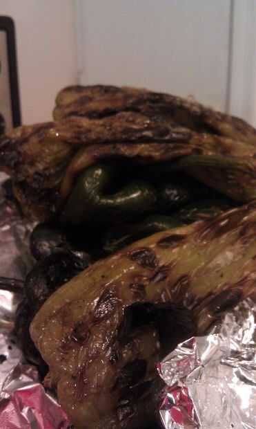 Quite la piel carbonizada de los pimientos y quitar los ajos de su piel.