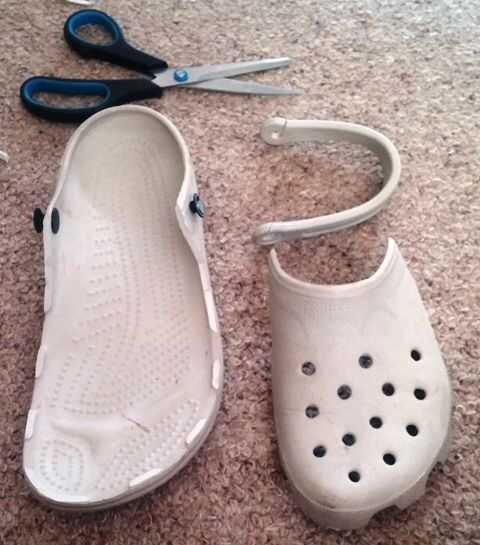 Segundo, corte la correa trasera y la parte superior del zapato y agujeros alrededor del borde de la suela. Apuñaló a derecha a través de app 4mm desde la parte superior, a distancia 4mm entre los agujeros.