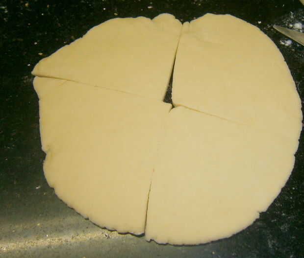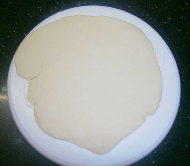Polvo el área de trabajo. Dividir la masa en dos y el rodillo con el rodillo a un círculo suave.