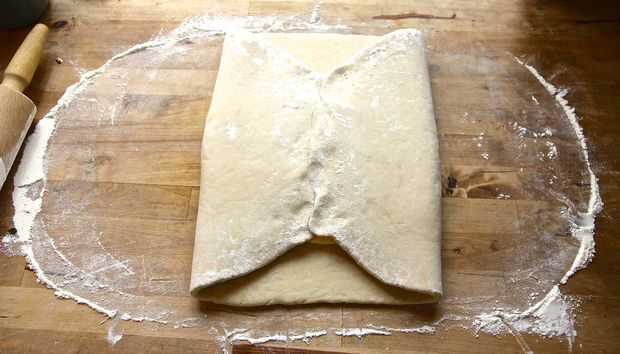 - Doblar los lados de la masa sobre la mantequilla para que se reúnan en el centro. Junte la costura firmemente pellizcando con los dedos.