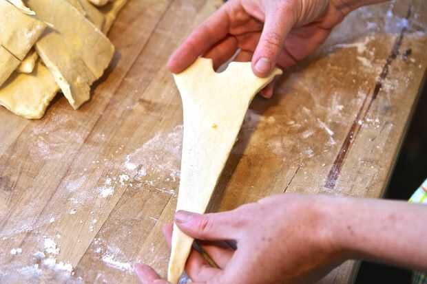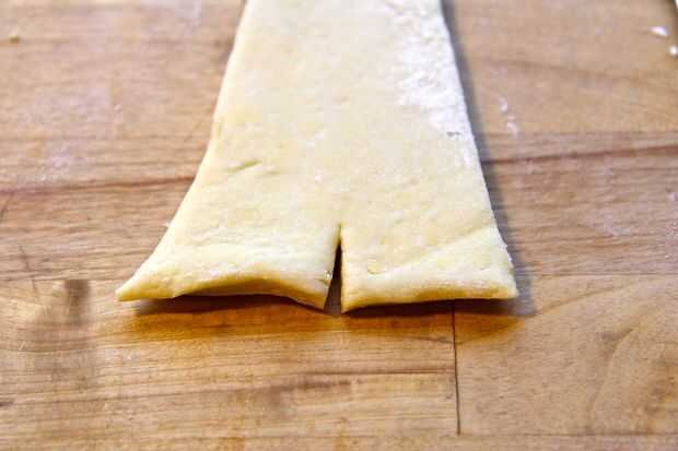 Coloque uno de sus triángulos en su contador. Corte una abertura de 1/2" en el centro de la base del triángulo con su cuchillo de cocina. Suavemente estire su triángulo manteniendo las dos esquinas de la base con una mano y la punta del triángulo opuesto con su segunda mano. Basta con estirar un poco su triángulo, y debe suceder naturalmente. Coloque el triángulo estirado hacia abajo sobre el mostrador con la punta del triángulo hacia usted.