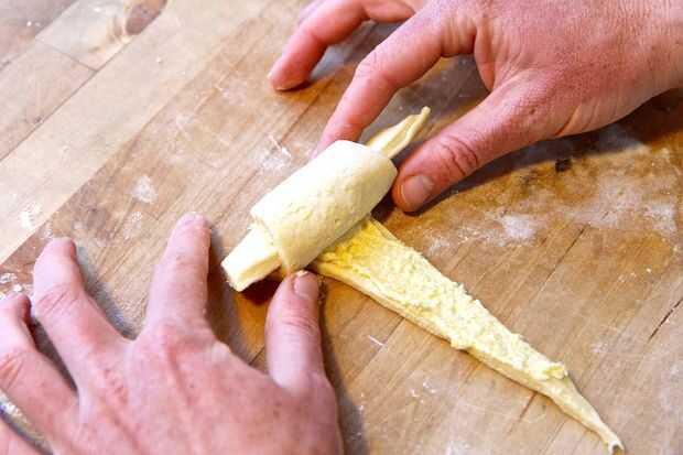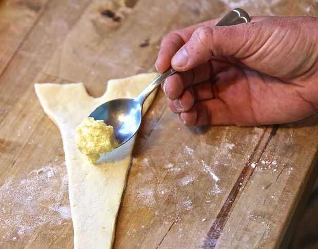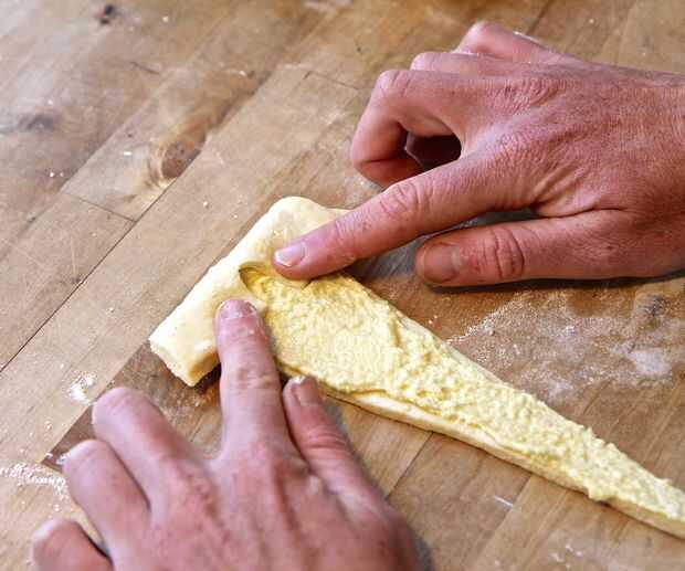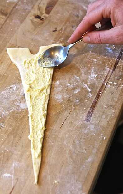 Una vez que han estirado todos sus triángulos, puede comenzar la almendra relleno y proceso del balanceo.