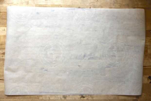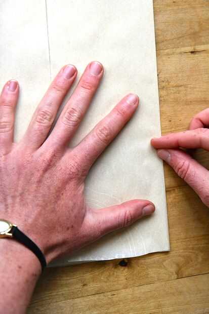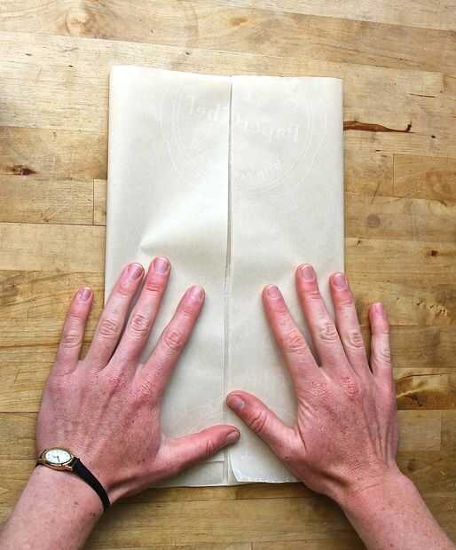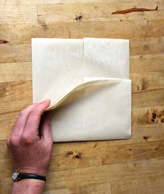 Corte un trozo de papel de pergamino que es 24" de largo. Doblar el pergamino por la mitad por lo que es sólo de 12" de largo y correr sus dedos a lo largo del pliegue. Rotar el rectángulo para que el lado cerrado es en la parte superior lejos de usted. Doble en los dos lados hasta que se encuentran en el medio, arrugando sus pliegues. Plegar la parte inferior (último abierto lado) hasta tener un cuadrado de 8". Asegúrese de que se han arrugado todos sus lados muy bien y firmemente por volver sobre ellos.