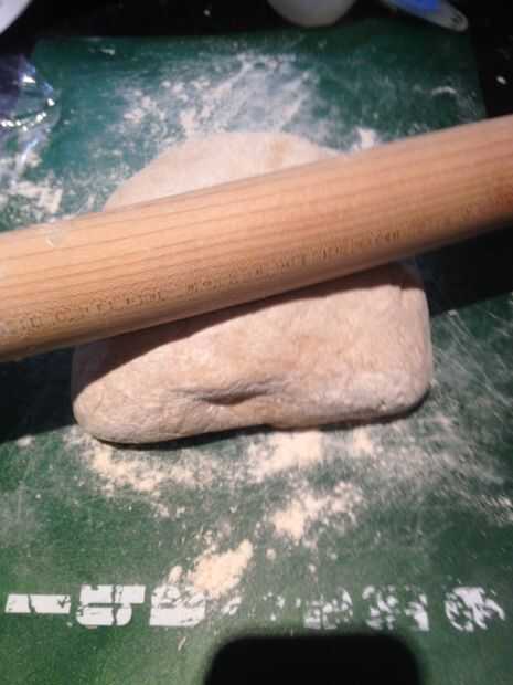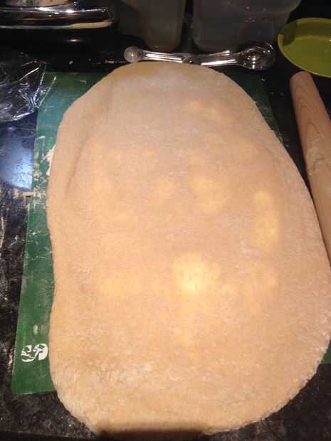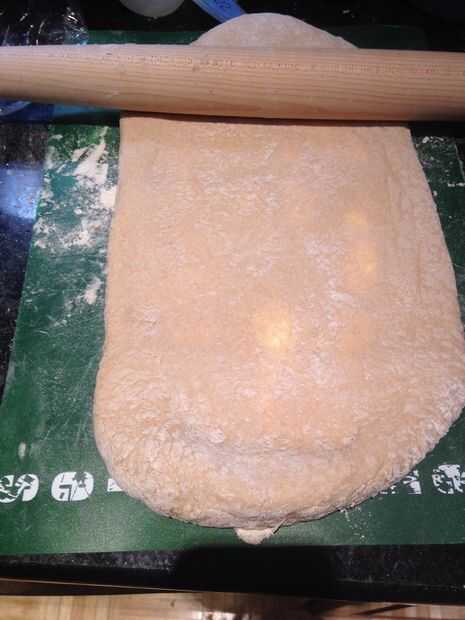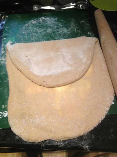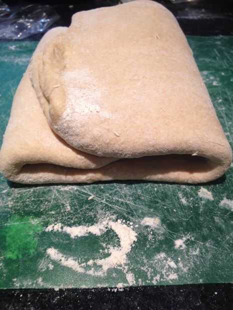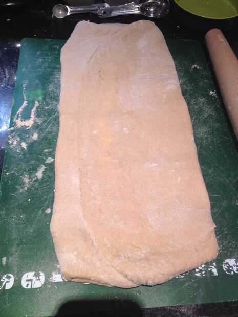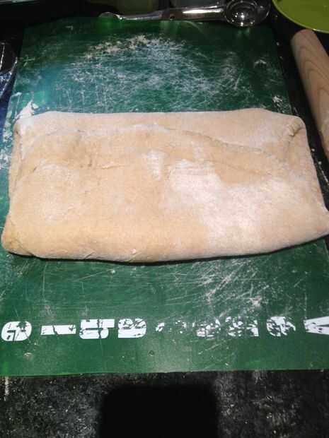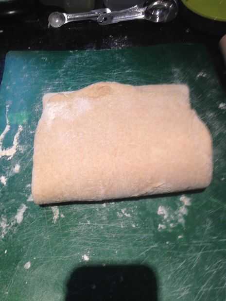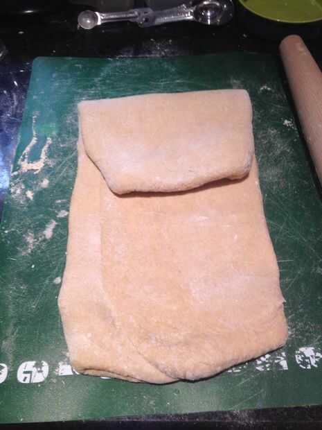 A continuación, voltee la masa y comenzar a rodar hacia fuera. Yo uso un rodillo francés, obras muy grandes. Quiere terminar con una forma rectangular (como 9 x 17 dice la receta original). Una vez tengas esto, entonces empiezas a plegable. Tomar un extremo y doblar a la mitad a la mitad de su masa, luego doblar el otro extremo en la parte superior. Esto le da una "envolvente" y es lo que crea las capas escamosas de lo croissant. Si la masa está todavía fría, siga adelante y estirar otra vez. Una vez que tiene una forma rectangular, toma un extremo y dobla la mitad, luego tomar el otro extremo y doblar en la parte superior. Luego meter en el frigorífico durante 15-20 minutos.