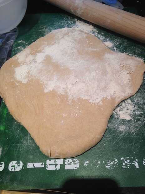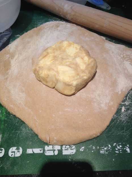 En primer lugar, sobre una superficie ligeramente enharinada, comenzar rodando cada lado de la Plaza hacia fuera. Desea que sea lo suficientemente grande para el cuadrado de mantequilla para sentarse. Una vez que has pulsado hacia fuera los lados del cuerpo, coloque el cuadrado de mantequilla en el centro y comenzar a envolver cada pestaña/lateral alrededor de él hasta cubrirlo. Utilice su pin de balanceo para golpéelo suavemente.