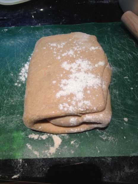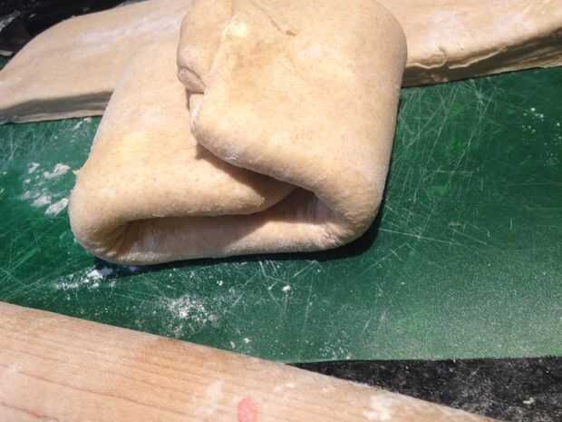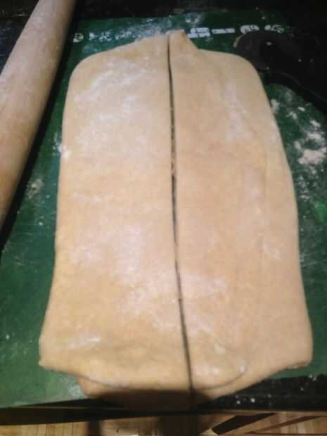 Rodillo la masa a una última vez, como en la foto #3 y luego usar un cuchillo, lámina de hojaldre o un cortador de pizza (que es lo que usé) cortar la masa por la mitad, verticalmente.