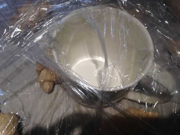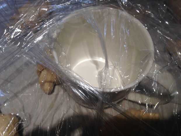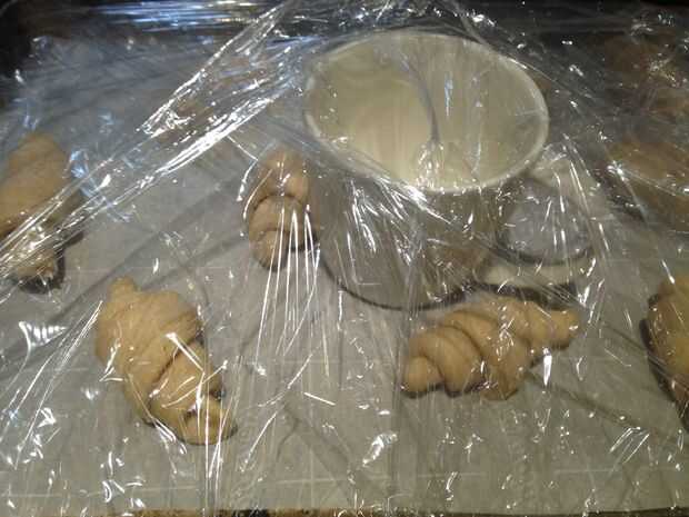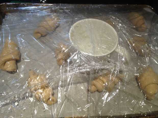 Después se forman todos sus croissants, que cualquiera desea seguir su cocción trampa en una caja de prueba o envolver firmemente con envoltura de plástico (también oí bolsas de plástico también). Antes de sellar el plástico, coloque una taza con agua caliente en el centro de ebullición y rápidamente. Esto ayuda a la subida de la masa. Yo generalmente lo cubre con una toalla y luego dejarlo durante 60-90 minutos o hasta que los croissants se han duplicado en tamaño.