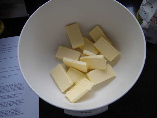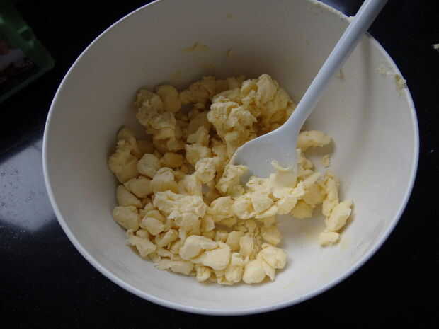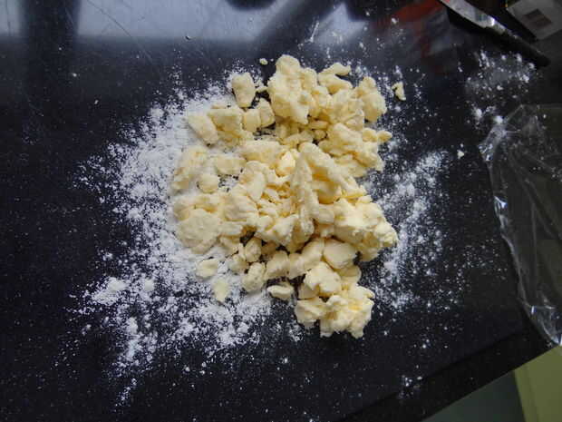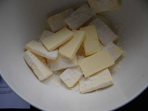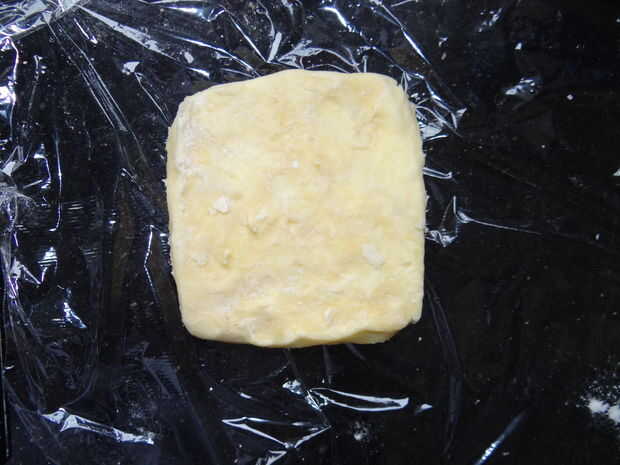 Como se puede ver en las fotos, corté la mantequilla en trozos, agregadas la harina, utiliza una cuchara para mezclar y al final, amasó a una bola. Era realmente un cuadrado, porque eso es lo que necesita más tarde.