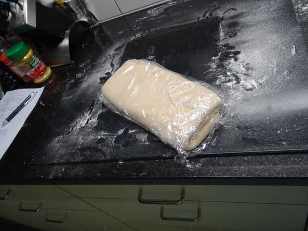 Puede darle un par de rollos con el pin y luego ponerlo en la nevera durante 30 minutos. Cúbrala con una película transparente, mientras que en la nevera.