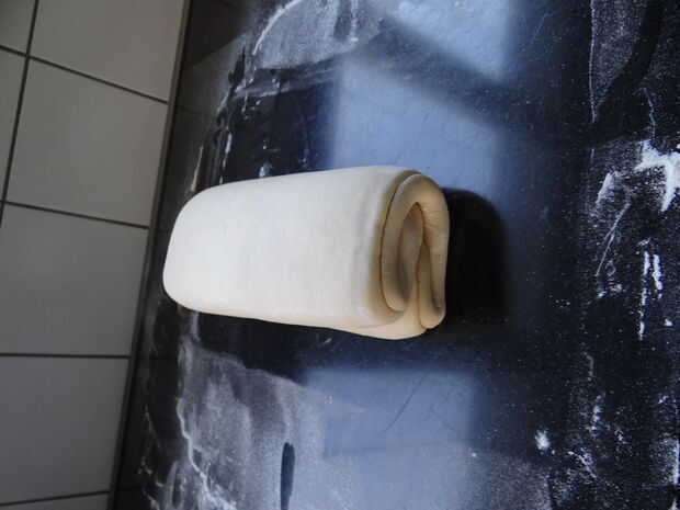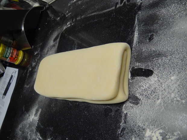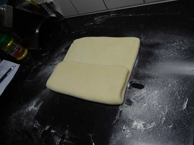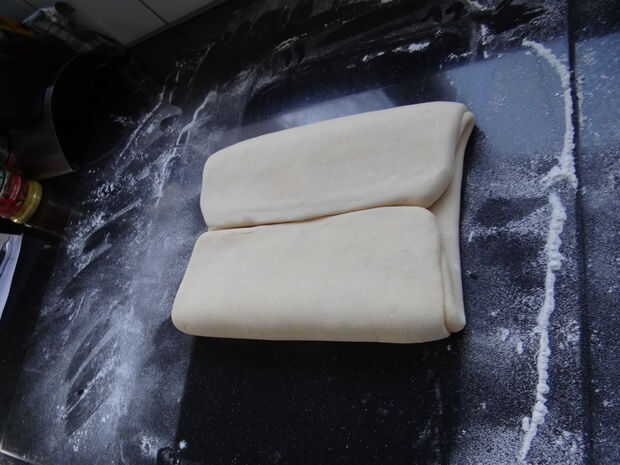 En el cuadro 7 puede ver dos aletas dobladas sobre la mantequilla. Es importante cepillar apagado exceso de harina entre las capas de masa. Es también una buena idea estirar las aletas como la plaza como sea posible, pero no tanto como la masa se rompe.