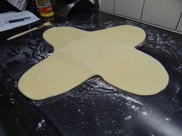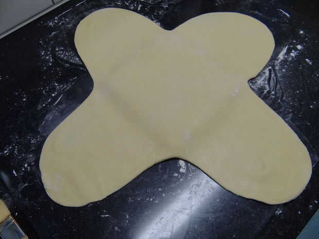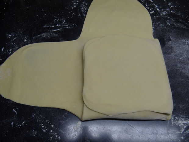 Como se puede ver en la cuarta foto, extienda el cuatro aletas mucho más delgado que la media plaza. La Plaza del media debe ser un poco más grande que el cuadrado de mantequilla. La plaza central en realidad debe ser cuatro veces tan gruesa como las aletas.
