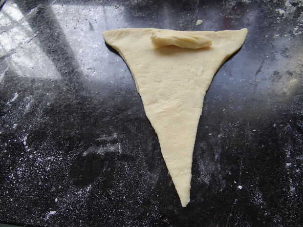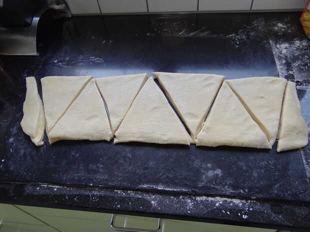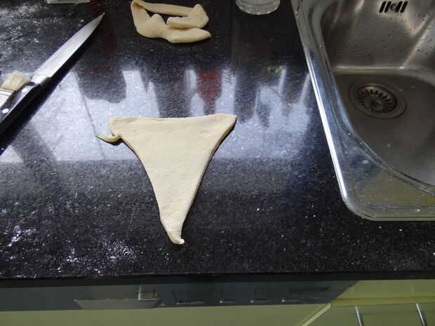 Ahora estira los triángulos en los extremos, quitar exceso de harina, poner un pedazo de masa de chatarra en el triángulo, como ves en la imagen 7.