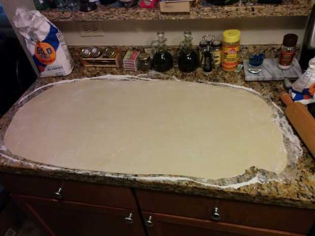 "costura" en la parte superior e inferior de su masa. - Girar la masa 90 º (un cuarto de vuelta) y estirar en un rectángulo de nuevo. El punto de esta rotación es que el borde abierto consigue mover a un borde cerrado cada vuelta.