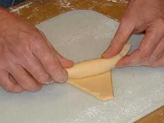 Enrollar cada uno de los triángulos de masa, a partir del borde sin cortar y hacia el punto. Entonces usted puede tirar de los extremos hacia el punto de hacer la tradicional forma de media luna, o dejarlas rectas.