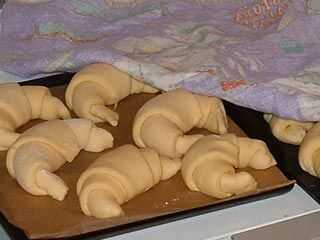 Colocar el laminado hasta croissants en una bandeja (en pergamino) para hornear cubierta con un paño y dejar en un lugar cálido a elevarse.