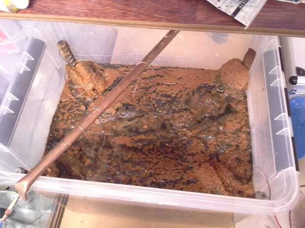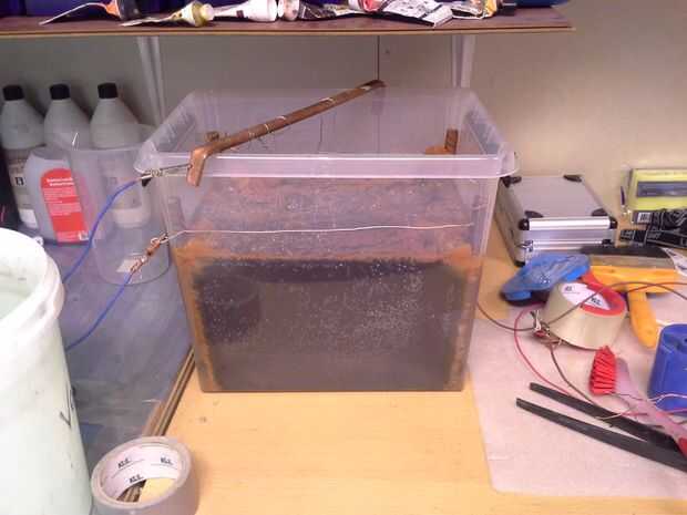 Se necesita 12V dc de una batería o alimentación. El cable negativo de la parte que desea eliminar el óxido de (cátodo). Como un anode(positive+), puede utilizar cualquiera de chatarra tienes.  Usar tiras de plomo también, sólo tiene que los electrones fluyan a través de la solución. Plomo no deteriorarse a sí mismo. En el video, yo uso alambre de acero para blindaje de concreto como un ánodo. Que se disuelven totalmente en este proceso. Sólo conectar y dejar durante la noche. Recuerde tratar las piezas rápidamente después de esto. De lo contrario se oxidará otra vez. Para mis herramientas, usé un cepillo de alambre de acero en mi amoladora de banco. Luego papel de lija, limpieza y una capa de níquel. Una buena mejora y la parte está listo para muchos años de servicio..!