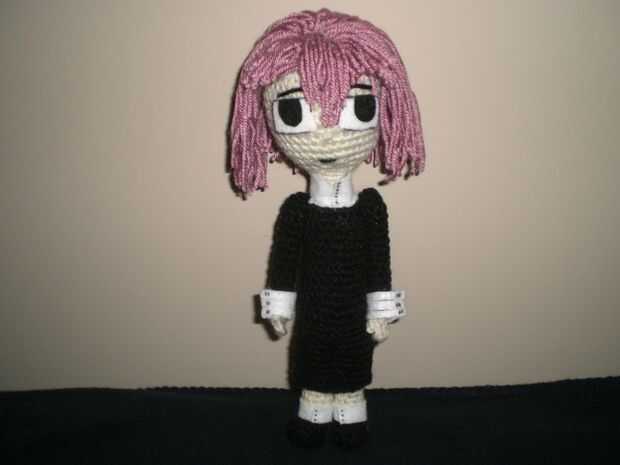 No he escrito un patrón de esta muñeca, pero voy a intentar explicar algunas cosas que he hecho. En primer lugar, he utilizado un anzuelo de tamaño G (para todo). Incrementé la cabeza hasta que he llegado a 36 puntadas (5 rondas o menos) y luego para la siguiente ronda, hice 1 sc en cada BLO (esto es donde empecé el pelo.) y luego hice filas 8 a 10 de a 1 sc en cada punto. Luego disminuí (1 sc, luego disminución, alrededor de todo el camino) hasta que llegué a 8 puntos de sutura. Cosas la cabeza antes de que llegara demasiado pequeño sin embargo. El cuello, creo que acabo de hacer unas pocas hileras sin aumentar, por lo que es 8 puntos en cada fila. En fila 4 del cuello, aumenta en cada puntada, lo que es 16.