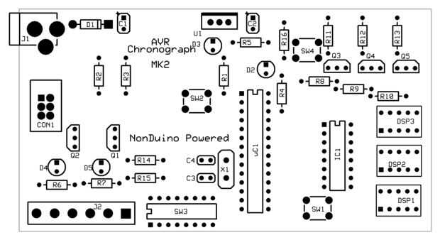 La primera imagen que se muestra en este paso se llama el dibujo mecánico. Muestra sólo los componentes y cómo encajan en la placa. ExpressPCB generará este dibujo para usted automáticamente en el archivo >> menú de exportación. La primera cosa a hacer es encontrar todos los agujeros que no están en este dibujo. Estas son las vias. Debes poner un trozo pequeño de alambre a través de cada vía y de la soldadura en ambos lados. Una vez se sueldan todas las vias, puede utilizar este dibujo con el esquema para soldar los componentes a la Junta. Si no es obvio, los componentes de introducir desde el lado de la capa superior y la soldadura en la parte de la capa...