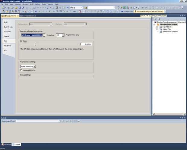 En la foto 2, en la parte superior derecha, verás destacados "ISP en AVR Dragon". Haga clic aquí para abrir una ventana para configurar las opciones de la herramienta al igual que cuando fijamos el bits del fusible. Hacer que su dragón del AVR es seleccionado y ISP para la interfaz y reloj de control del ISP. Debajo de eso, ajustes de programación debe ya han "borrar chip todo" seleccionado y "preservar la EEPROM" desactivada. Su circuito de protoboard de potencia, conecte el cable de cinta de 6 pin del dragón, y somos buenos ir.